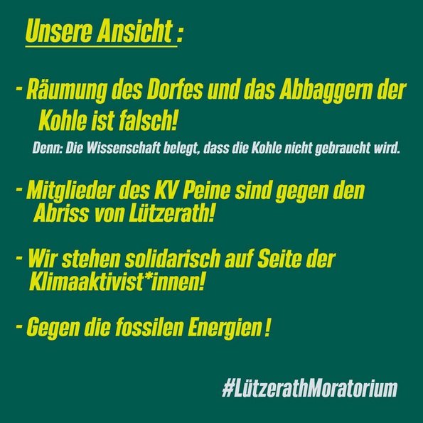 Der Kreisverband der Grünen Peine spricht sich gegen den Abriss von Lützerath aus und stellt sich hinter die Klimaaktivist*innen zum Schutz des Dorfes Lützerath vor einer Räumung. Denn, die Räumung von Lützerath und das damit beabsichtigte Abbaggern von Kohle ist falsch. Die Wissenschaft belegt, dass die darunterliegende Kohle nicht gebraucht wird. Deshalb fordern wir ein Moratorium für Lützerath.