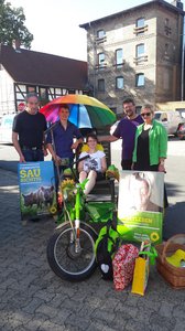 Der Wahlkampfwagen der Vechelder Grünen kommt erstmals zum Einsatz. Gezogen von den beiden Kandidatinnen für den Vechelder Gemeinderat, Claudia Wilke und Martina Goetzke, und gut gefüllt mit allerlei Informationen geht es um ca. 11.30 Uhr weiter zum Einkaufszentrum, wo alle für weitere Gespräche oder einfach zum Kennenlernen zur Verfügung stehen.