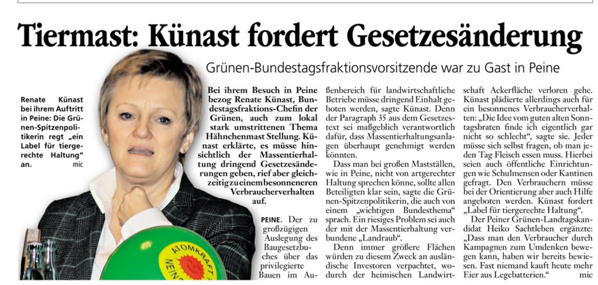 Die Energiewende, auch mit Schwerindustrie wie am Stahlstandort Peine, Bildung und Inklusion sowie die stiefmütterliche Behandlung der Integrierten Gesamtschule (IGS) durch Schwarz-Gelb seien Themen im Wahlkampf gewesen, erfuhr Göring-Eckardt. Bei der IGS gehe es nicht um Inhalte, sondern um Ideologie, waren sich alle einig. Auch Massentierhaltung wurde angesprochen - hier müssen die Grünen noch mehr Druck machen. Das sieht Göring-Eckardt ebenfalls so: "Wir brauchen starke Grüne, nicht nur um abzufangen, was die SPD verliert, sondern auch inhaltlich. Allein an die Macht soll die SPD nicht." Es gebe Mehrheiten für viele gesellschaftliche Themen, die nicht die politischen Mehrheiten widerspiegeln. "Am Sonntag werden uns tief in die Augen schauen und sagen: Ja, es hat geklappt." jti