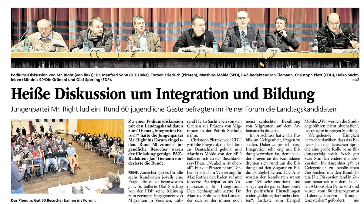 Die PAZ berichtete auführlich über die Veranstaltung der "Jungenpartei Mr. Right" vom 26.11.. Auffälig war, dass sich der Kandidat der "Piraten" durch einen jüngeren Mann vertreten ließ. Bislang vollkommen unüblich, geht es doch um die Direktkandidaten im Wahlkreis. Man kann gespannt sein, wer bei der nächsten Veranstaltung -zielgruppengerecht?- eingesetzt wird.