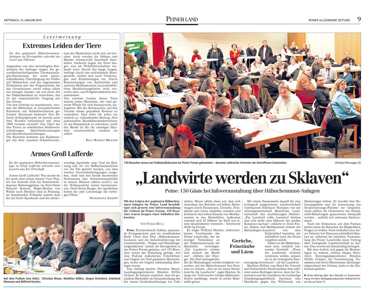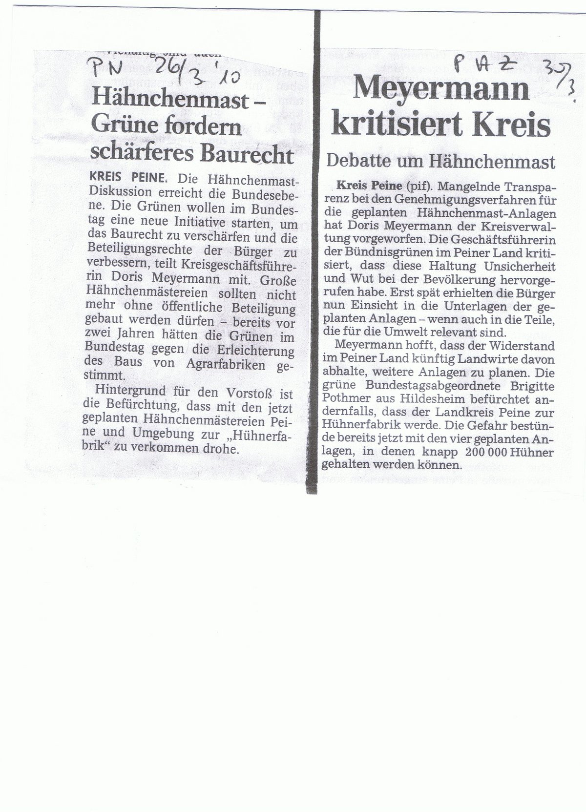 Mit den jetzt geplanten Hähnchenmästereien drohen Peine und Umgebung zur Hühnerfabrik zu verkommen, erklärte die niedersächsische Bundestagsabgeordnete Brigitte Pothmer, „Das schafft Profit für Hühnerfleisch-Barone, schadet aber Mensch, Tier und Umwelt“.